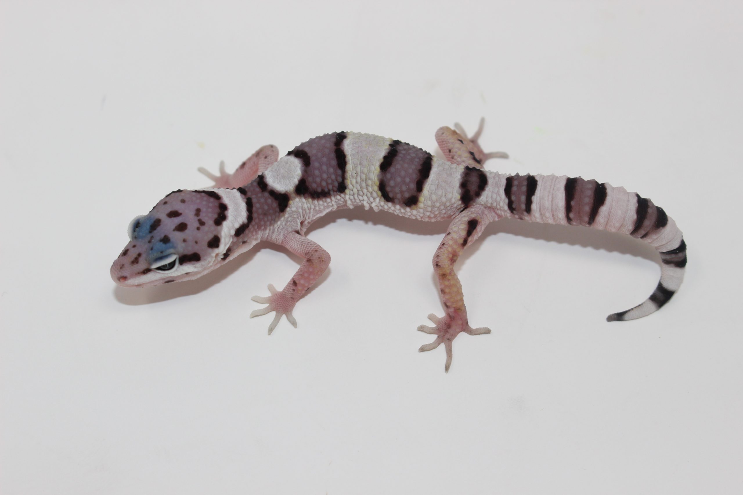 Mack Snow is an incomplete dominant leopard gecko morph that replaces the typical yellow background with white or silver-gray. This juvenile displays clean white base coloring with bold black banding — a striking contrast that makes Mack Snows some of the most visually appealing leopard geckos available. Super Mack Snows (homozygous) are nearly all white. Feeding well and handling calmly.