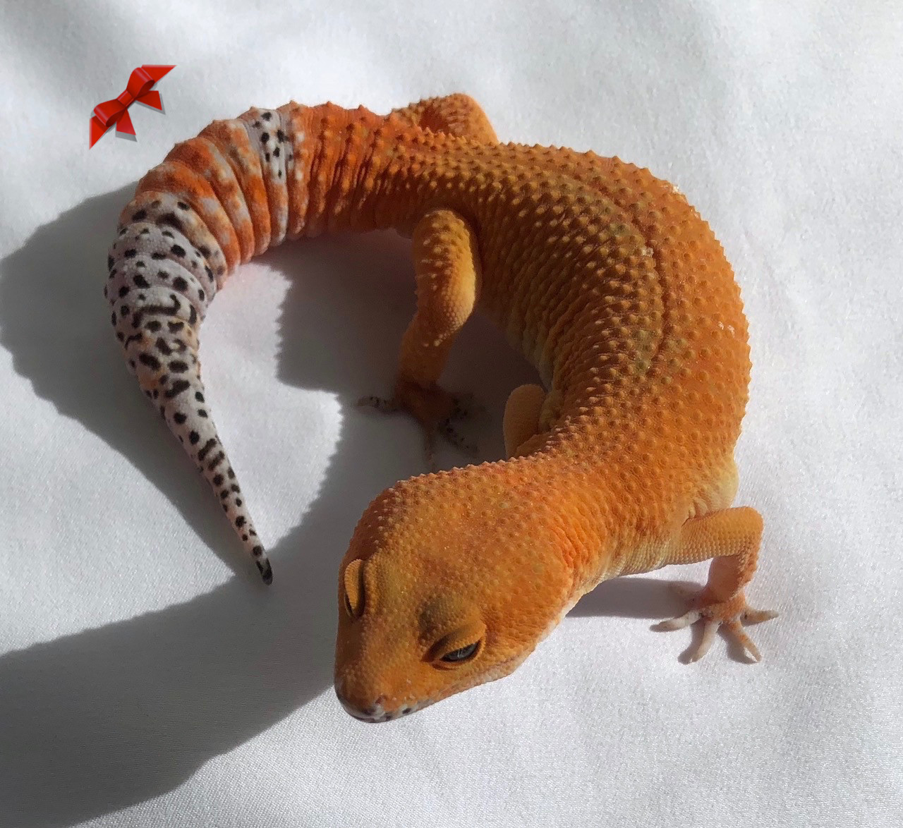 Tangerine leopard geckos are selectively bred for intense orange coloration. This juvenile already shows strong tangerine hues across the body and tail that will intensify with maturity. Tangerines are one of the most popular leopard gecko morphs for their vivid, warm colors. Healthy, well-started, and feeding on dubia roaches and mealworms. Makes an excellent display animal and breeding project foundation.